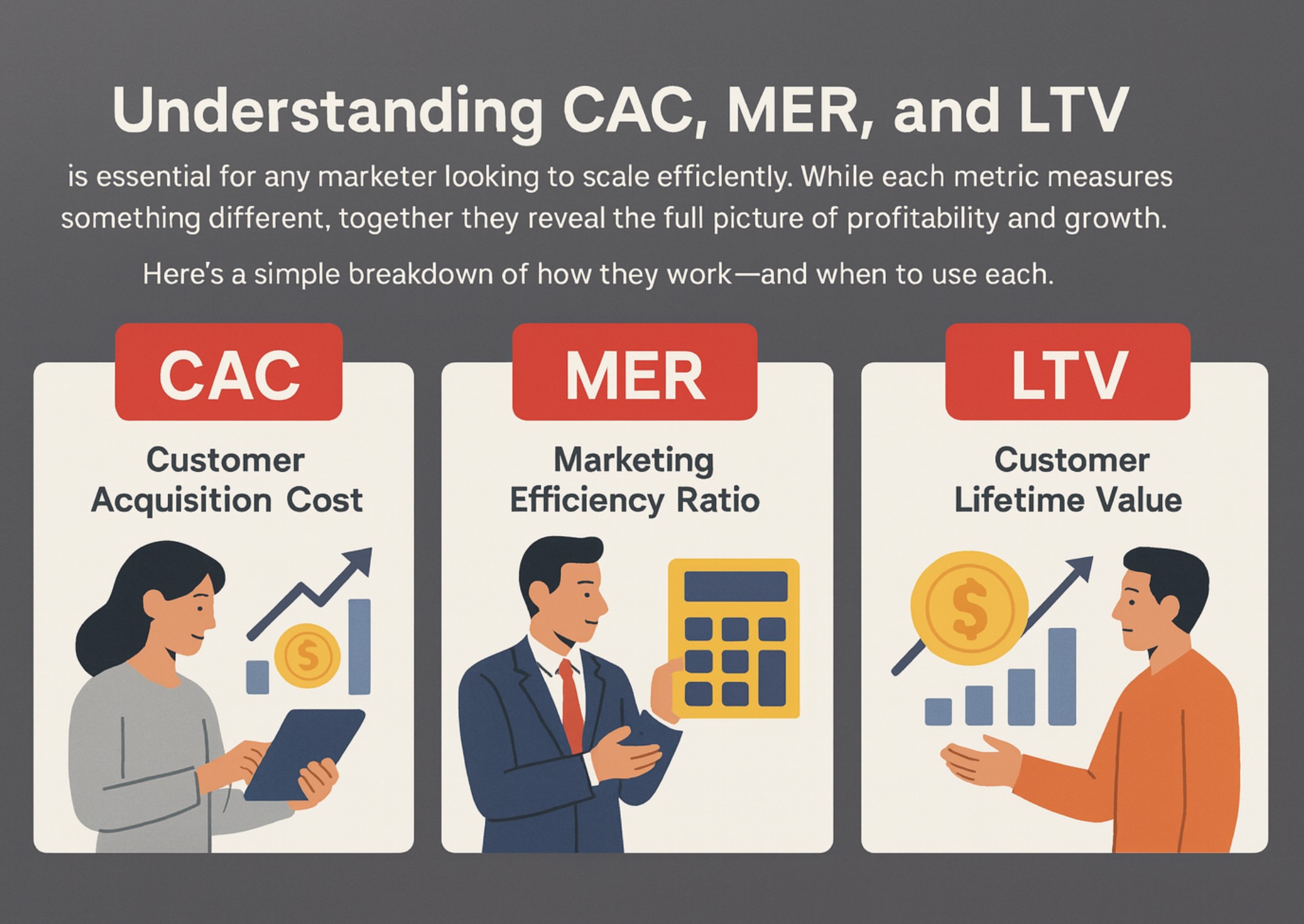 In marketing, the strongest strategies are built on numbers—not guesses. Among the most important metrics guiding performance and investment decisions are CAC (Customer Acquisition Cost), MER (Marketing Efficiency Ratio), and LTV (Customer Lifetime Value). Although they measure different parts of the revenue engine, they’re deeply connected. Understanding how they interact allows marketers to scale confidently, identify opportunities, and protect profitability.